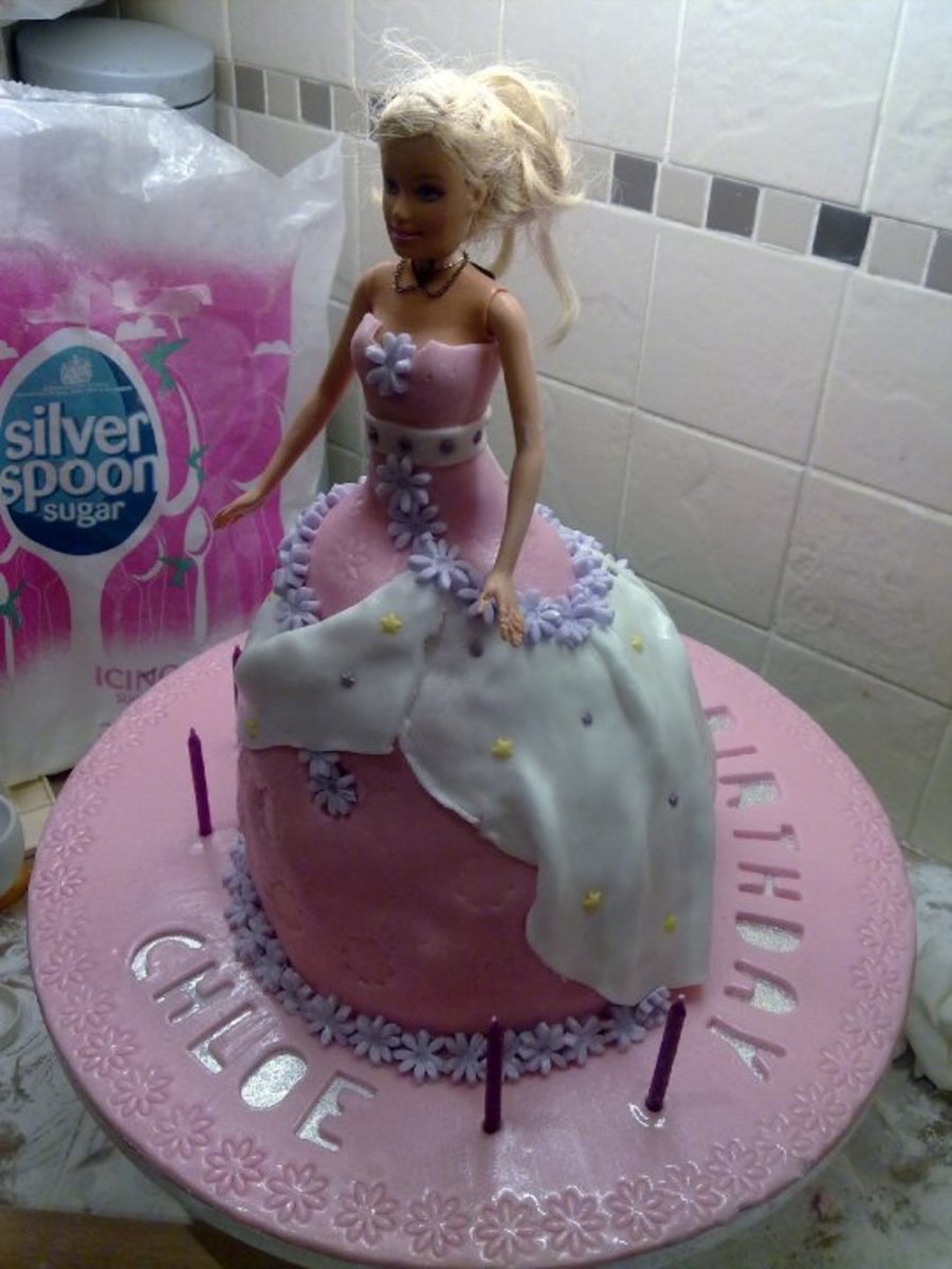 This cake was made up of four seperate pieces of sponge, with a circle cut out of the centre for the doll to be inserted. This was for my neice and i used her fave doll...she loved this cake. This was for her 4th Birthday so i opted to make the colours over the top and very catoon like, hence why this looks so busy. This was a vanilla sponge, with chocolate fudge filling.