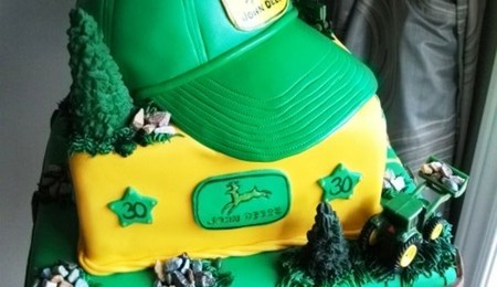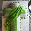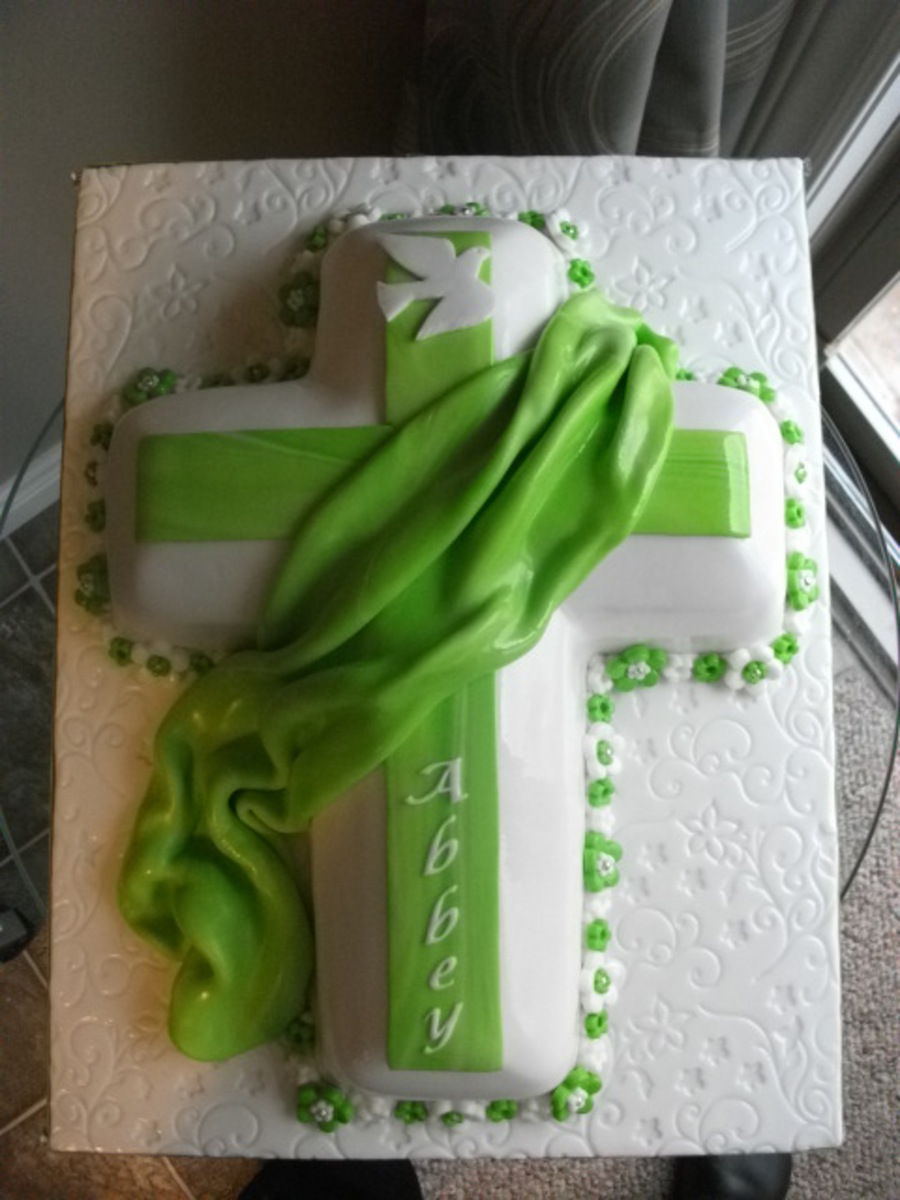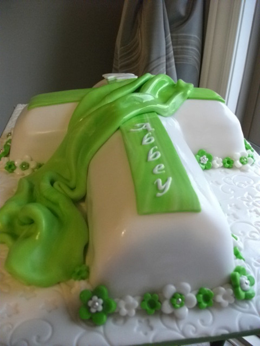 White Cake with raspberry buttercream filling, covered & detailed in Fondant. Lime green is Abbey's favorite colour.