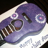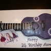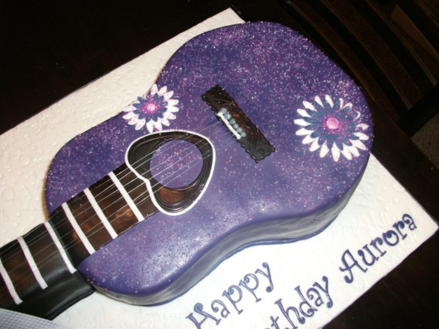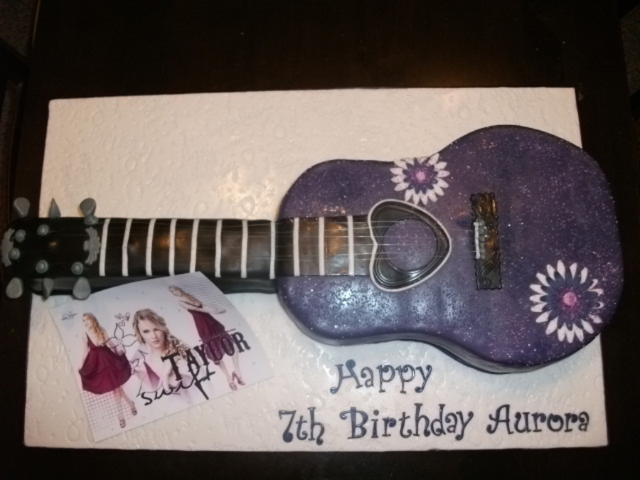 Marble cake for the guitar with chocolate buttercream, marble cake for the guitar arm with creamcheese buttercream. Fondant covered and detailed. Fishline strings. A printed keepsake photo of Taylor Swift.