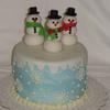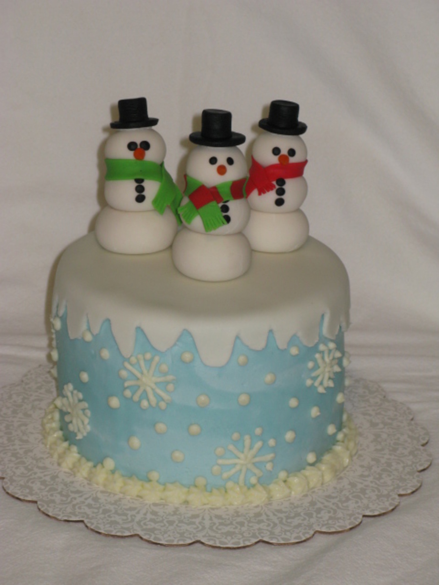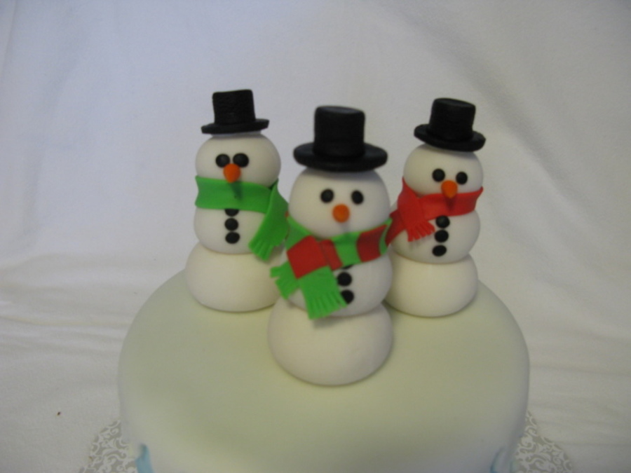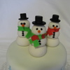 Chocolate WASC with chocolate ganache filling; Gumpaste snowmen with black MMF hats, all hand made by me.