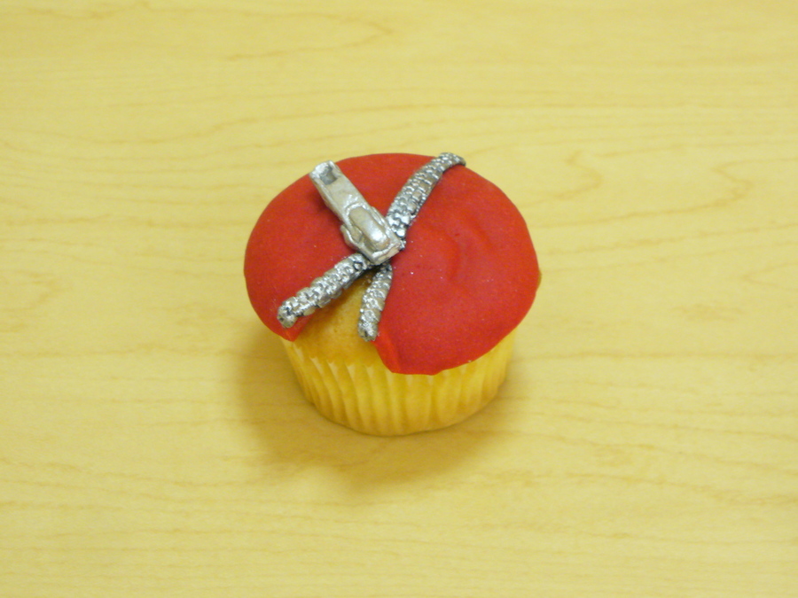 FOndant covered cupcake. The zipper was made in a mold. The fondant was cut open to make the zipper look like it was being zipped to reveal the cupcake underneath.
