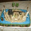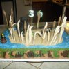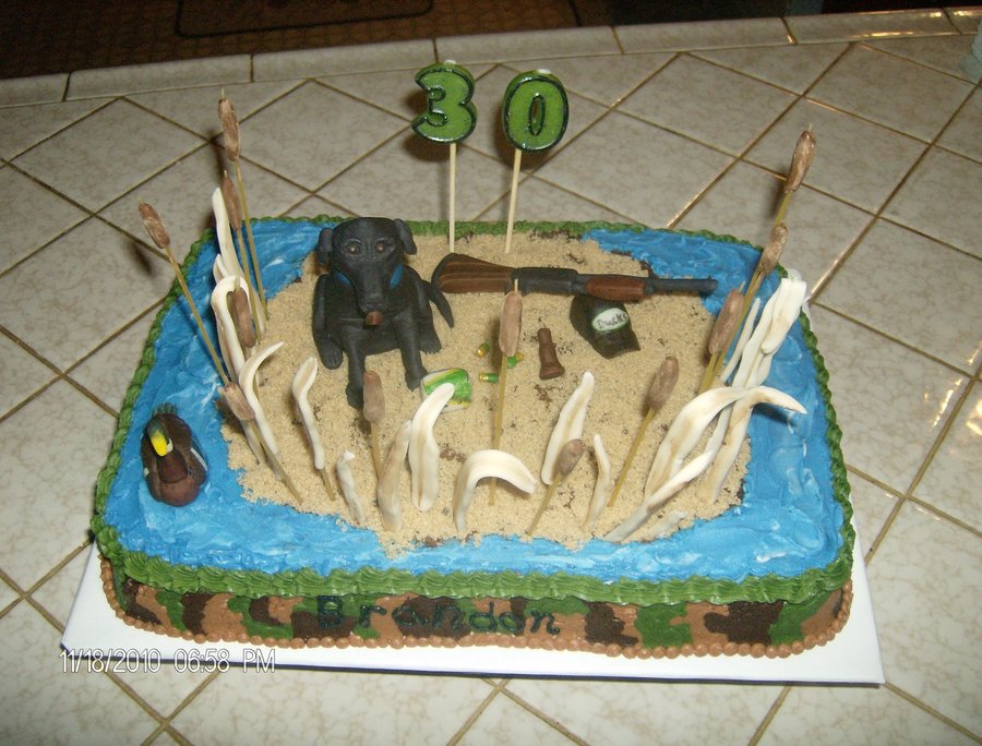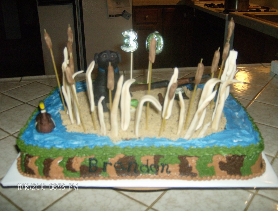 Buttercream icing. Dog, duck, gun, hat, shells are fondant cattails are tootsies rolls on scewers rolled in cocoa and grass is also fondant . Brown sugar to make it look like sand.