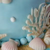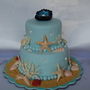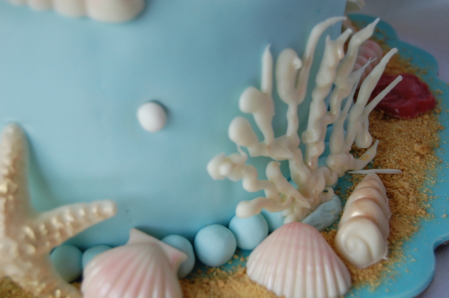 Special request made by a birthday girl for a Seashell Cake. Top Tier - Light Chocolate sponge cake filled with smooth Vanilla Buttercream. Bottom Tier - Four layers of moist Vanilla cake filled with velvety Chocolate Fudge Buttercream White chocolate Starfish and seashells with a dusting of bronze and pink shimmer to give them a luxurious look.. Close up of the Coral (dusted with pearl shimmer) nestled on a bed of edible sand. Hand made Oyster shell with a beautiful pearl - all dusted with Pearl Shimmer