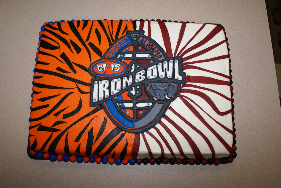 I received a request for an Iron Bowl cake and found this one on this site and customer loved it. Auburn half is French Vanilla w/swirled orange and blue and buttercream icing. Alabama side is Red Velvet w/swirled black and cream cheese icing. They loved it..Always makes you happy!!!