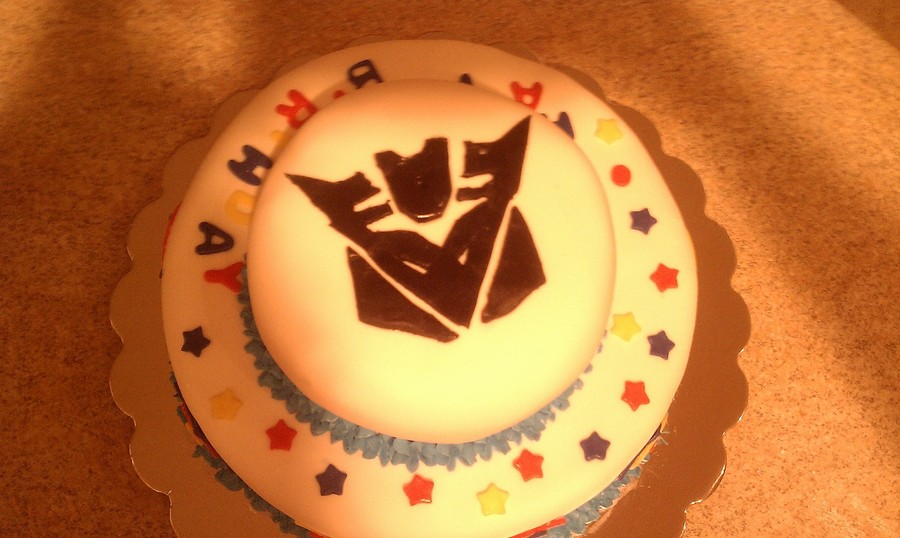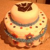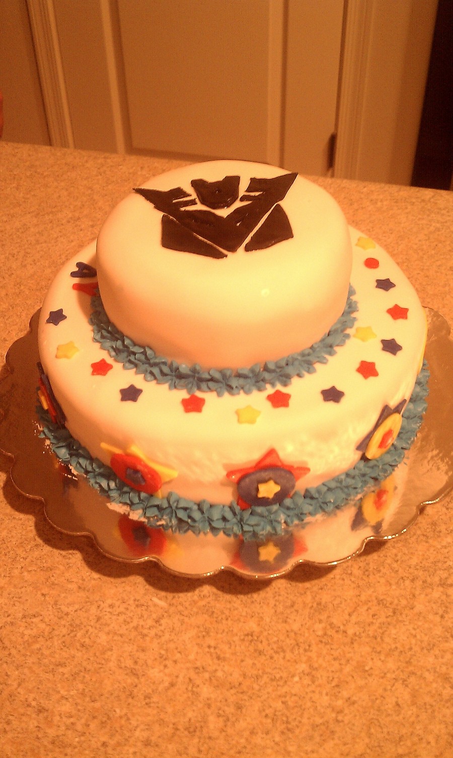 2 tiered chocolate cake with peanut butter chips covered in white fondant and decorated with fondant cut outs