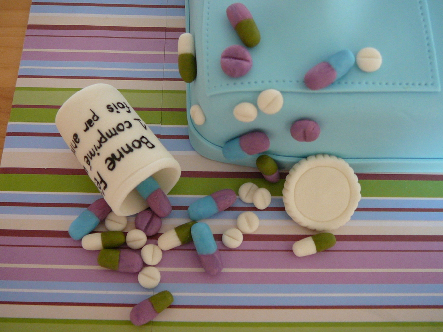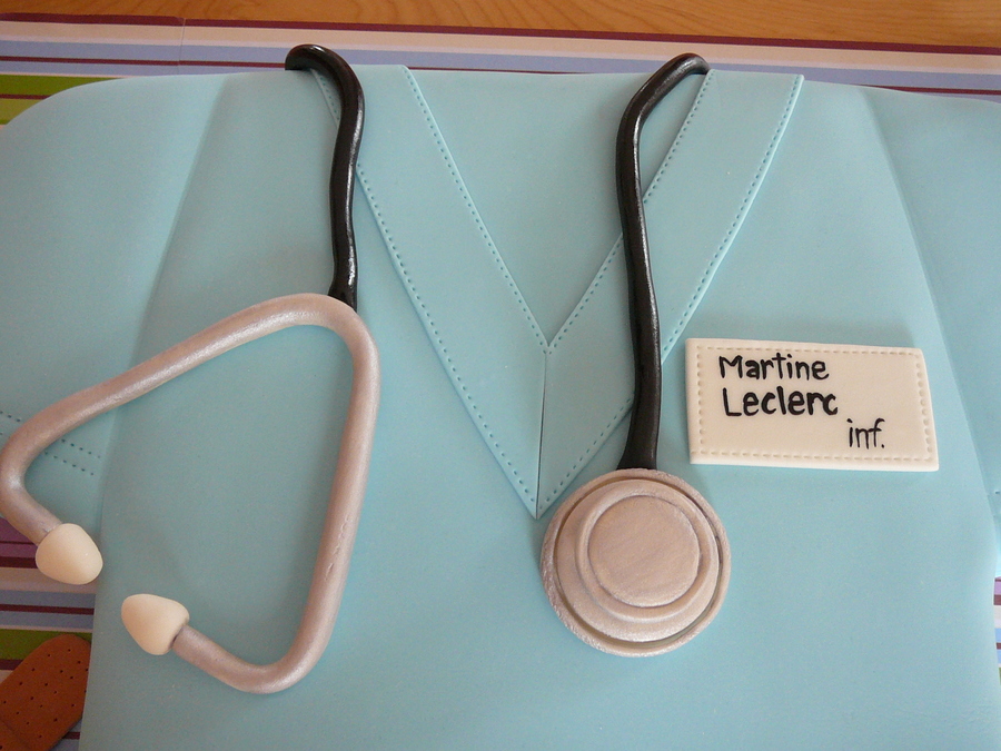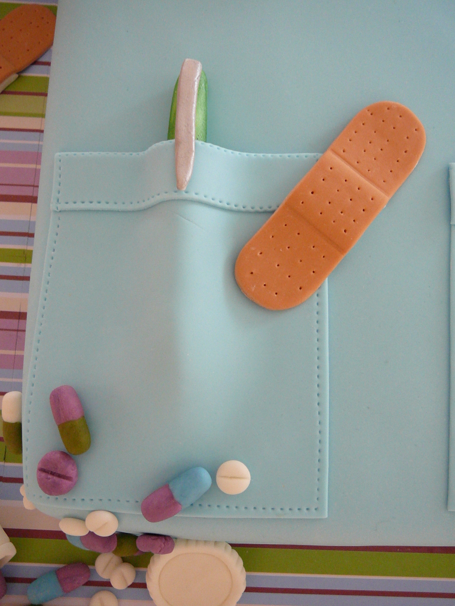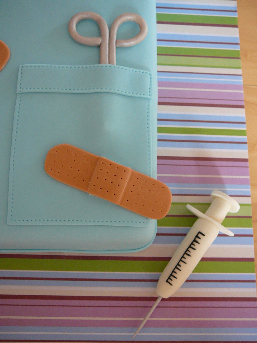 This cake was for my sister-in-law Martine who is a nurse. Thank you to all the CC'ers for the inspiration, I put a lot of cake ideas together and had a lot of fun to do this cake! This is vanilla cake with buttercream and raspberry jam filling covered with fondant. All the details are fondant and edible except for the syringe needle who is a toothpick painted with silver luster dust.