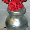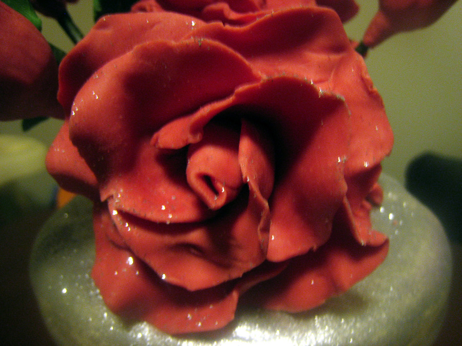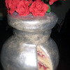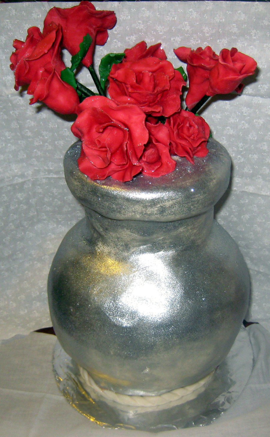 Vase shaped cake with chocolate leather roses (on lollipop sticks), Vanilla cake with strawberry filling & pinapple buttercream frosting. Vase is covered in MMF & American Silver disco dust.
