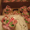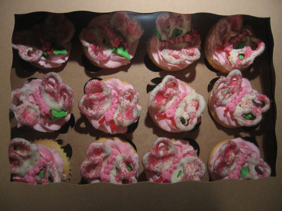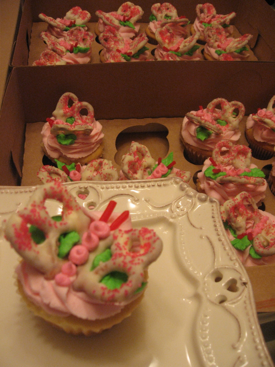 White chocolate-dipped mini pretzels were the wings for these butterflies on cupcakes for a five-year-old's birthday celebration. Buttercream piped on first, then green leaves in BC and two wings together and the body piped on in pink. The antennae are twizzler ropes.