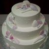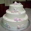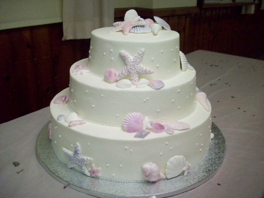 Three tier cake, iced in buttercream, decorated with sugar shells dusted with lustre dust.