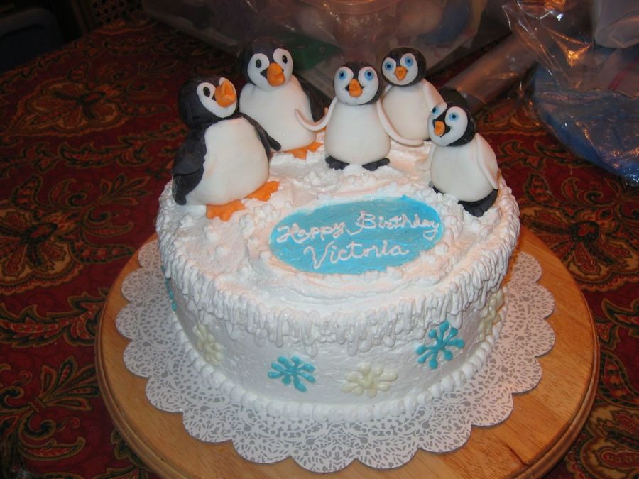 This is the first cake I made as an order. She wanted a penguin cake. It is yellow sour cream cake with strawberry filling. It has buttercream frosting. I made the fondant penguins ahead of time as well as the chocolate snowflakes which I did on wax paper freehand.