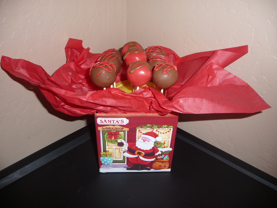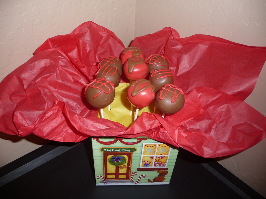 Chocolate cake pops in a decorative holder. Making for Neighbors Christmas gifts. =-)