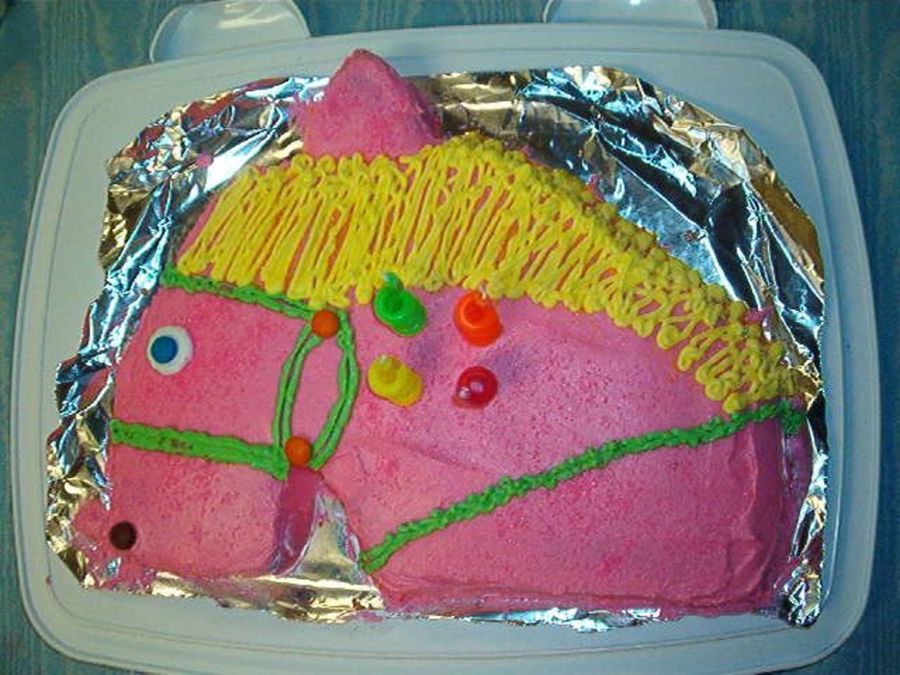 My daughter wanted a pink horse for her birthday. She didn't like any of the horse cake pans, so I cut this one out of 11x13 pan.
