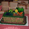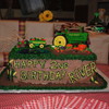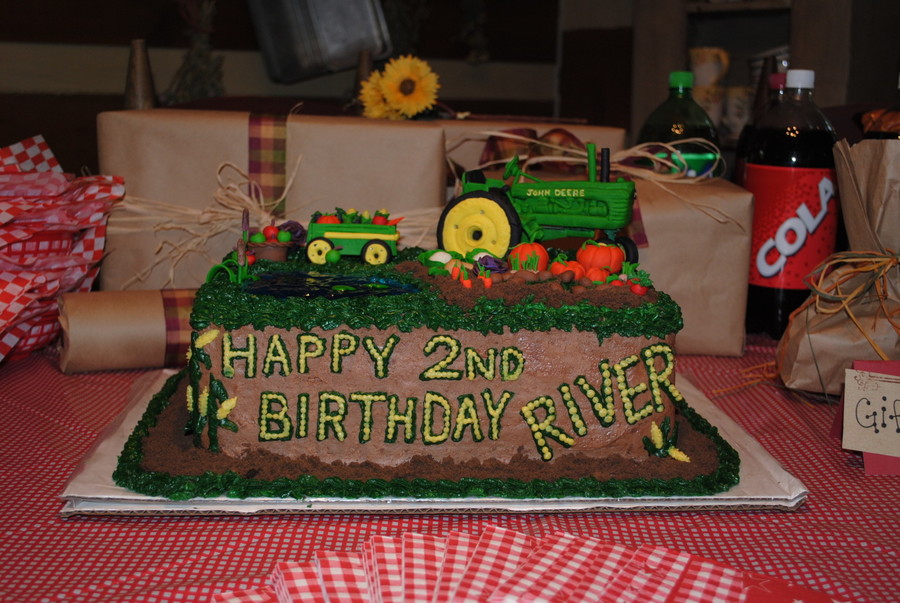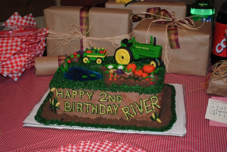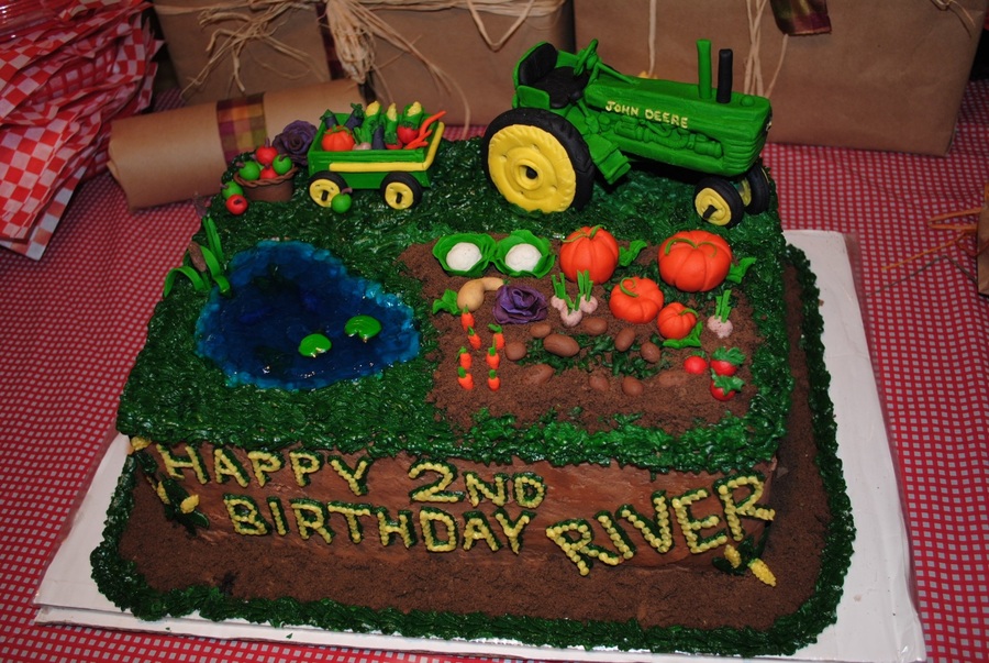I made this tractor cake modeled after a similiar one I saw online for my son's 2 year old birthday. I added a jello pond complete with wavy fondant grass and fish beneath the surface. Cake is all edible, with even the tractor made of fondant. Cake is a malted milk ball cake recipe with malted milk ball icing. Hope everyone likes it, I had a blast making it!