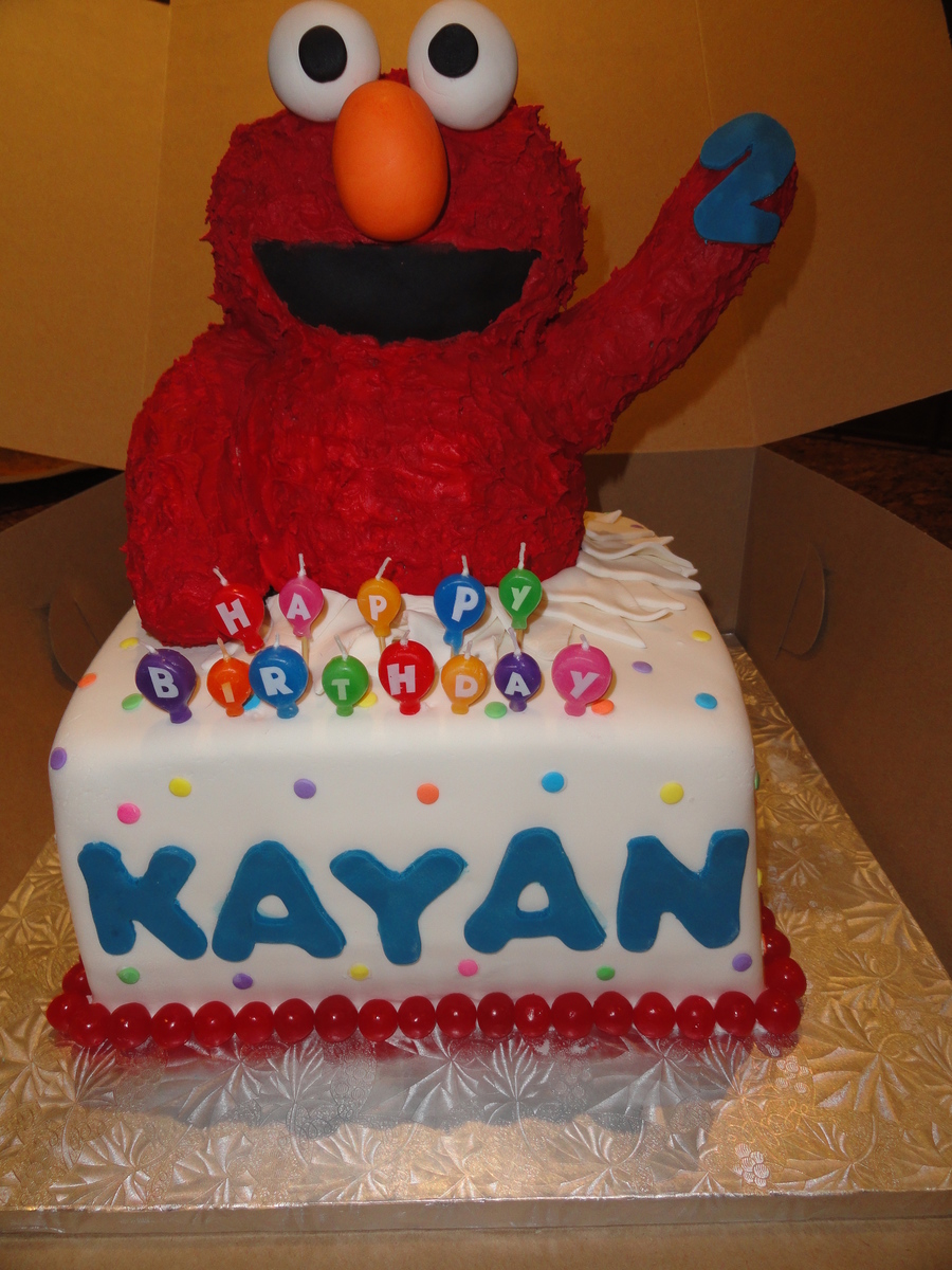 Elmo cake made for a 2 year old boy. Balloons were added in his hand after delivery and set up.
