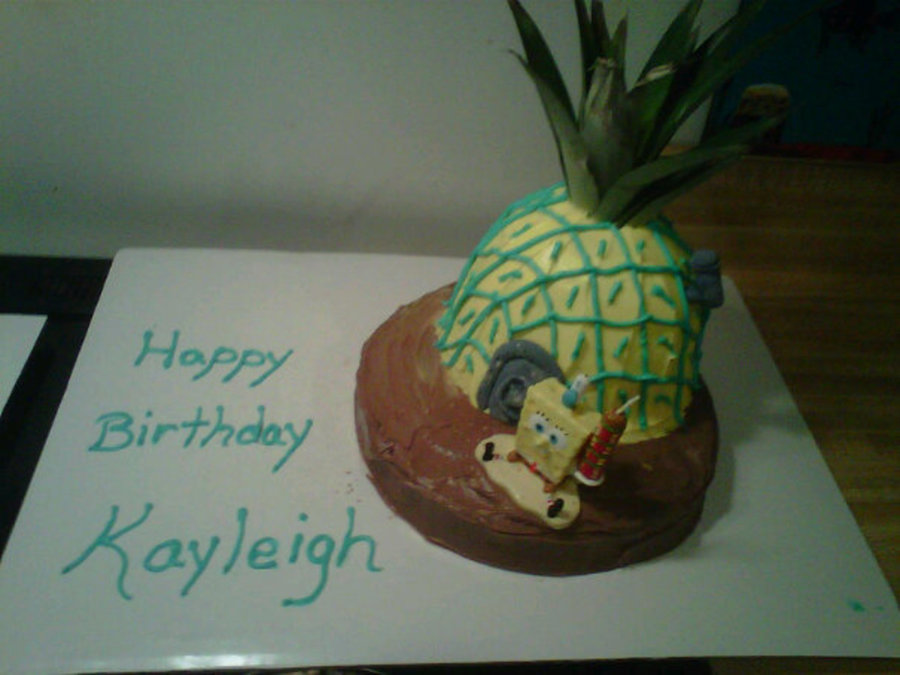 I made a pineapple flavored cake with coconut butterrcream icing and the Wilton Doll Mold for the pineapple shape. After the cake cooled I trimmed down the sides a little to look more like a pineapple. I used real pineapple leaves for the top.