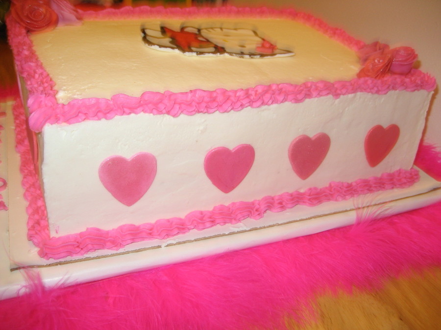 I got a requested for a young lady who wanted a Hello Kitty cake in all pink. This was my first time doing a cake in all buttercream (aside from the accents). Smoothing the buttercream took awhile but was well worth it! It was my first time piping as well. The Kitty is made out of fondant and painted with food coloring. The roses and hearts are fondant as well.