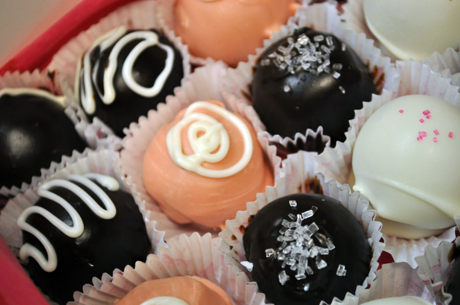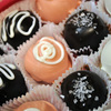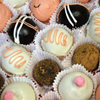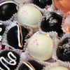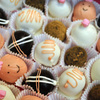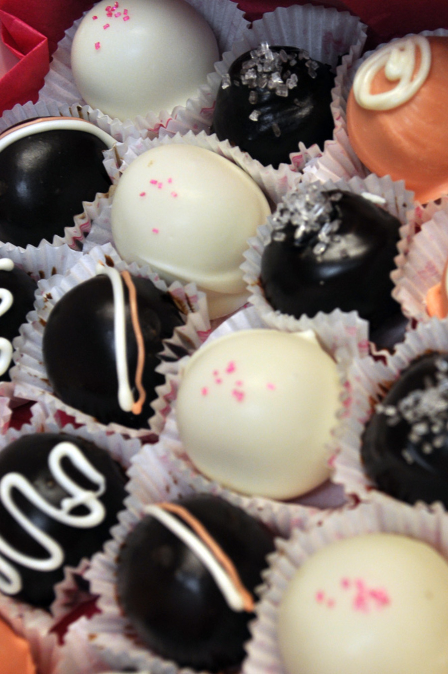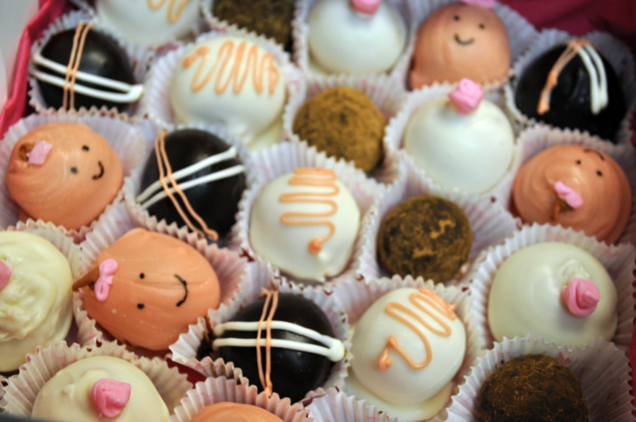 Two boxes, and 50 of these cute little cruffles. I did them in ten different styles, Chocolate Guinness cake with dark chocolate ganache, and pink champagne cake with white chocolate.