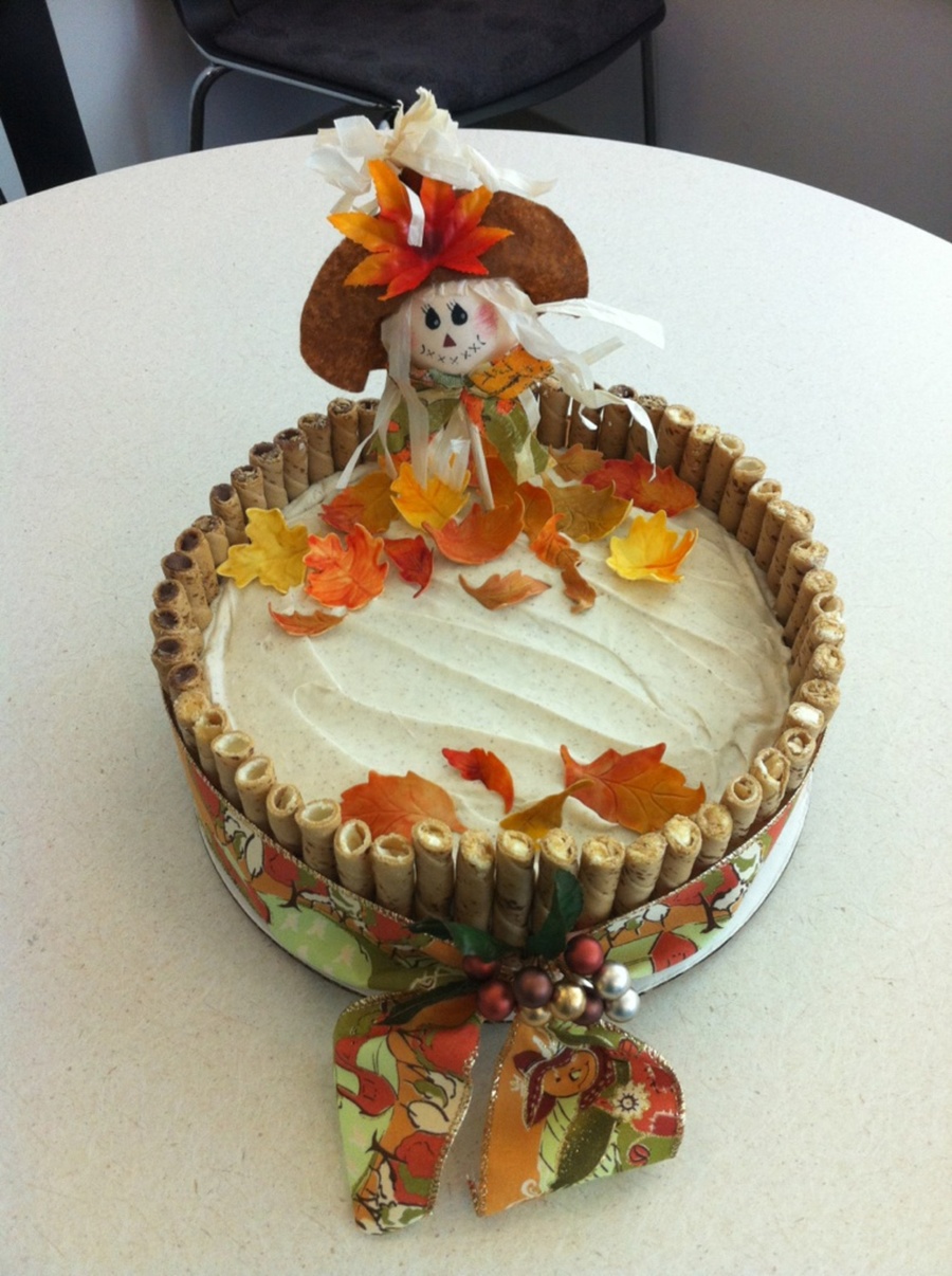 pumpking spice cake frosted with cinnamon creamcheese frosting surrounded by rolled wafer cookies decorated with 50/50 gumpaste/fondant hand painted fall leaves, scarecrow, and fall ribbon