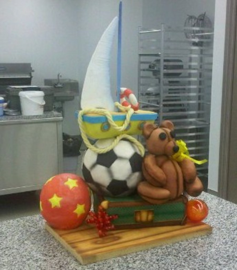 This was a cake we completed in our sculpted cake class at the French Pastry School. I worked on this cake with a partner and we spent approximately 24-30 hours on it. The luggage case, sailboat and red ball are all made out of cake. The teddy bear is made out of rice krispie treats and the soccer ball is the only inedible part- it's a styrofoam ball covered in fondant. Thanks for looking!