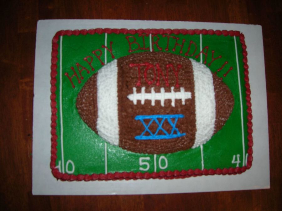 This cake was for a suprise birthday/Superbowl party. The base cake is plain yellow cake and the football is devils food cake. All icing is buttercream.