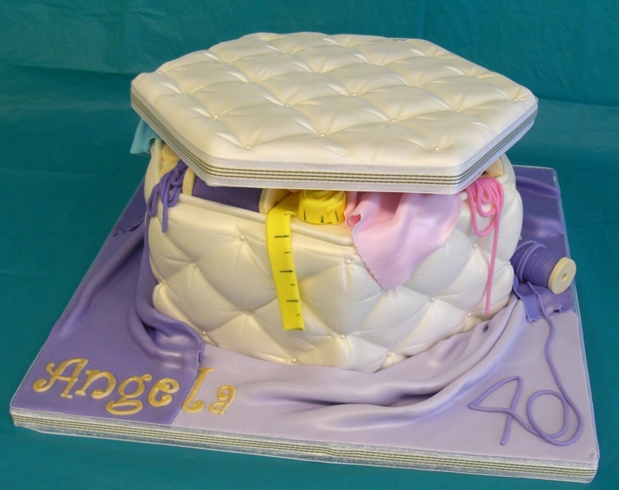 Thank you to M_Mischief for her inspirational cake and her U tube video for doing the quilting. Cake was a 10" cut into a hexagon. gumpaste and fondant accessories. Lid is fondant covered 1/2" foam core.