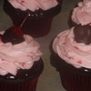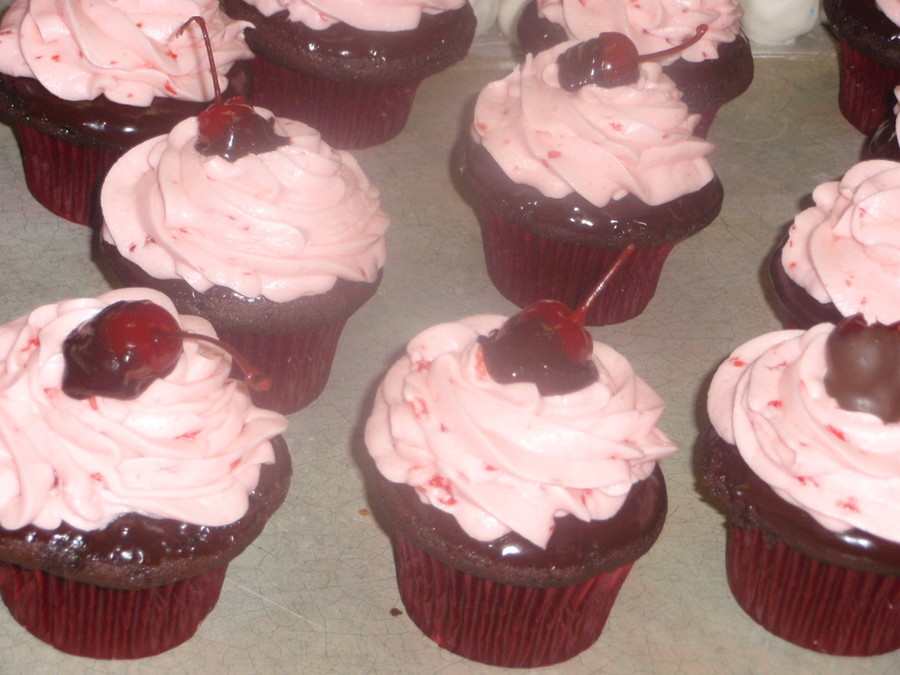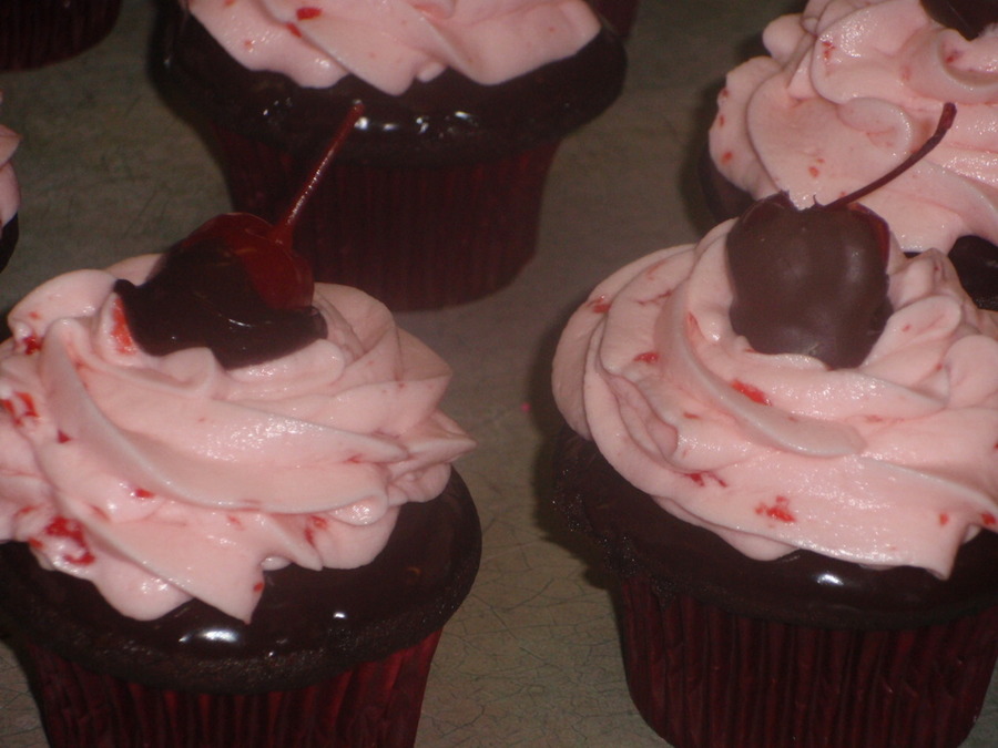 Chocolate/chocolate chip cake dipped in chocolate ganache, topped with cherry vanilla buttercream and a hand dipped chocolate cherry