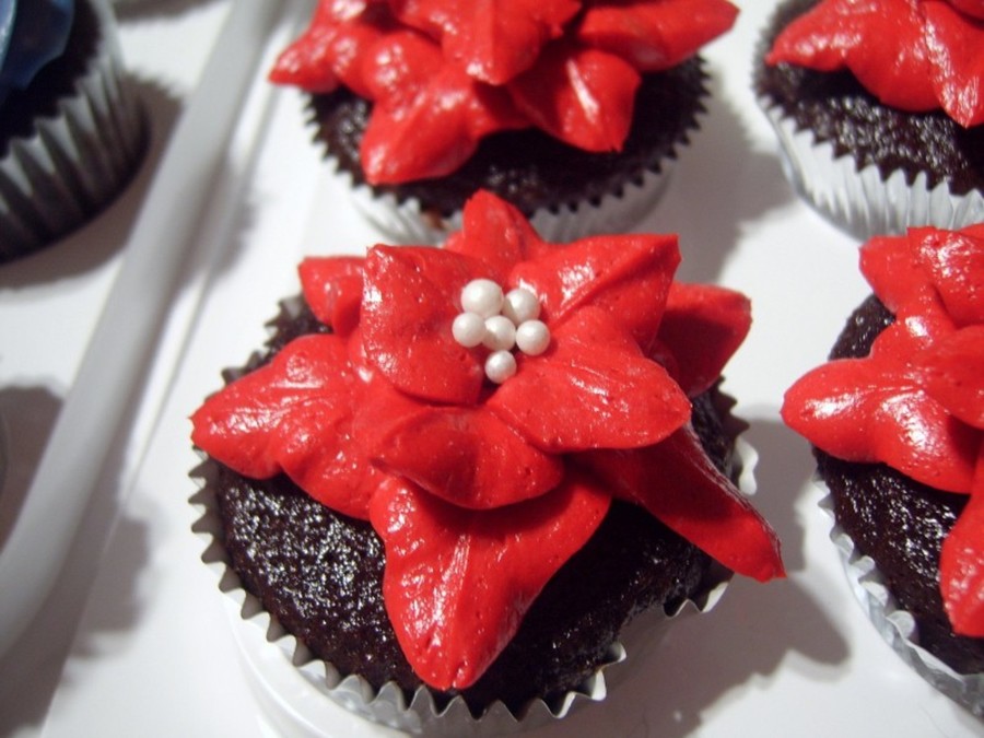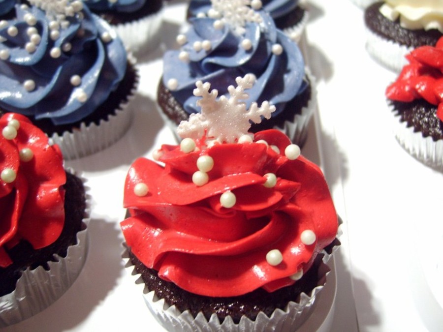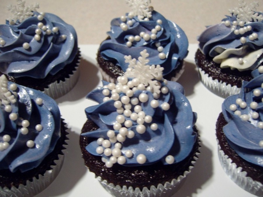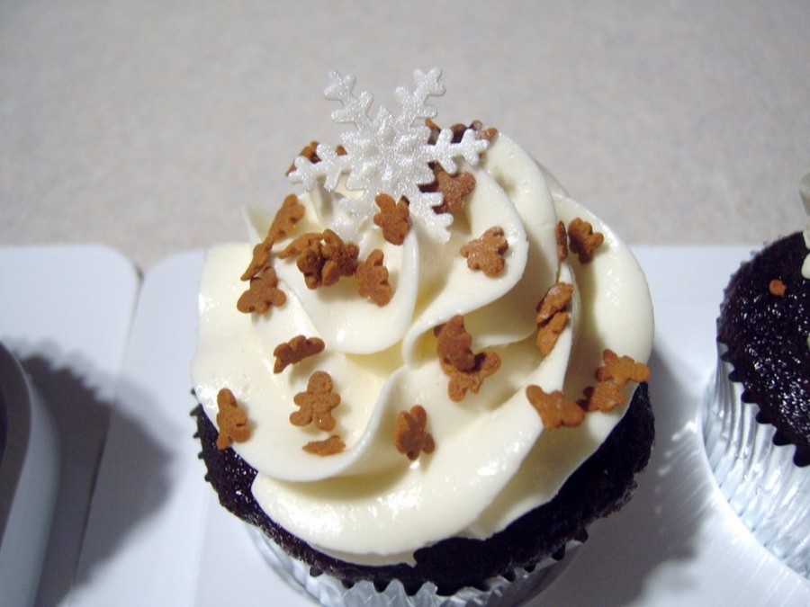 Cupcakes for my daughter's school's secret Santa shop. MMF snowflakes made with a PME plunger, Wilton sprinkle gingerbread men and Wilton sugar pearls