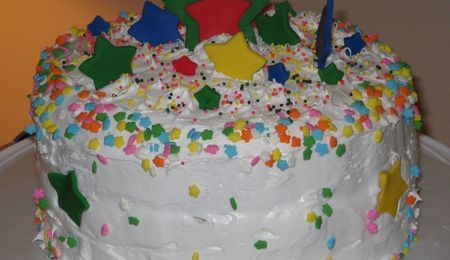 Made the decorations from white and milk chocolate, 2 layer funetti cake, filled with french vanilla pudding and frosted with white buttercream frosting.