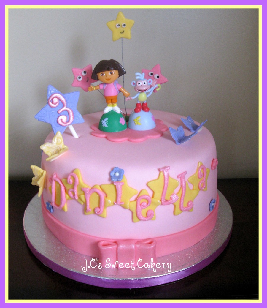 8" vanilla w/cookies & cream filling. Gumpaste butterflys/explorer stars/#3. Plastic figures. Fun to make:) TFL