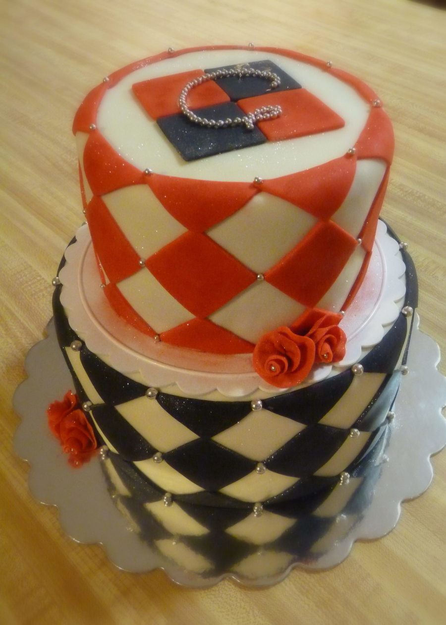 Checked pattern cake with ribbon roses and dragees. Bottom tier chocolate with oreo filling and top tier chocolate with creamcheese filling. All accents fondant.