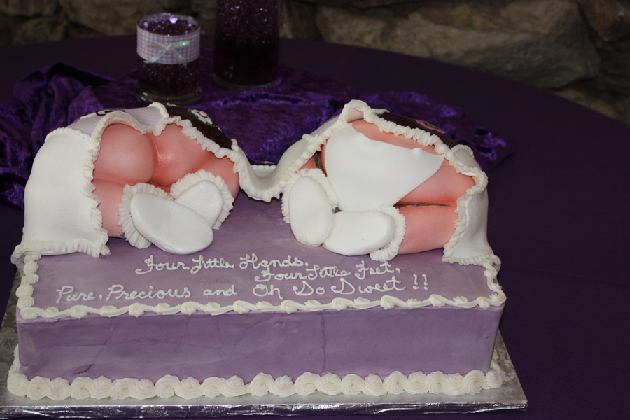 Baby shower cake for twins, all edible including baby behinds and custom blanket :)