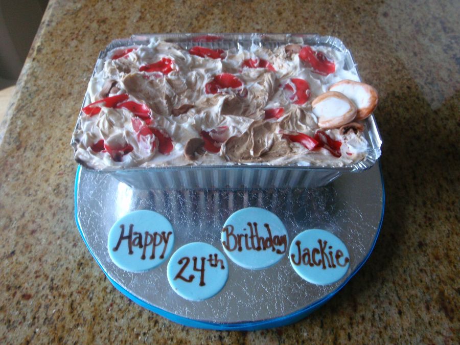 My best friend makes this amazing pepperoni dip with cream of mushroom soup, cream cheese and pepperoni. It is what she known for, so for her bday what better way to honor her then to make a pepperoni dip cake! buttercream with fondant mushrooms and fruit rollup pepperoni.
