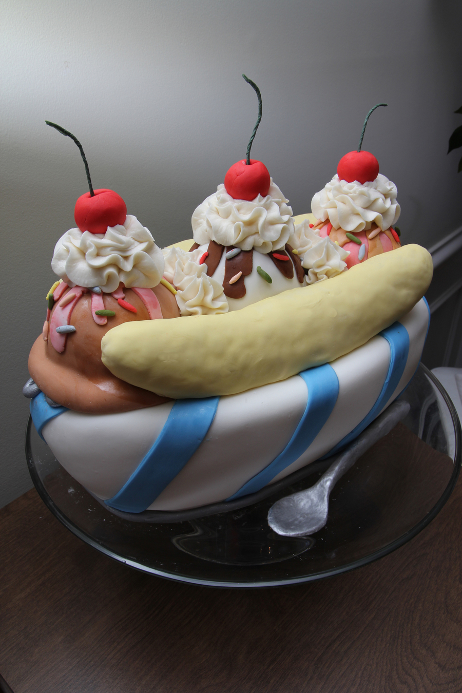 Thank you CCr's for the inspiration! My son asked for an ice cream themed bday party, so this is what I decided to make. Hand-carved pound cake covered in fondant, with RKT bananas, buttercream "whipped cream" and fondant cherries. TFL!