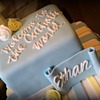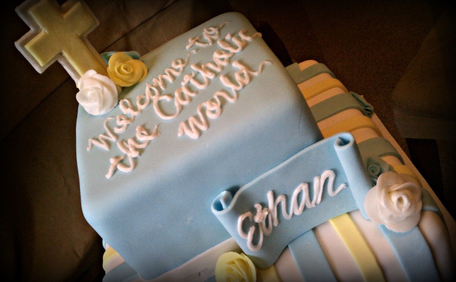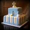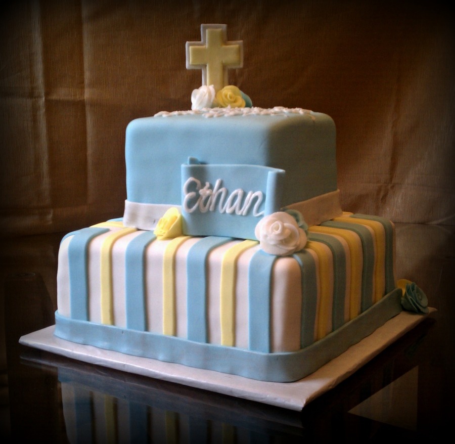 Blue and Yellow 2 tier Christening Cake. 6" / 10" squares