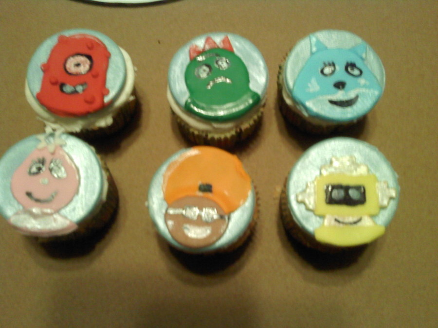 Cupcakes that go with the yo gabba gabba birthday cake. Vanilla cupcakes with indydebi bc, and fondant accents. Sorry for the horrible picture.