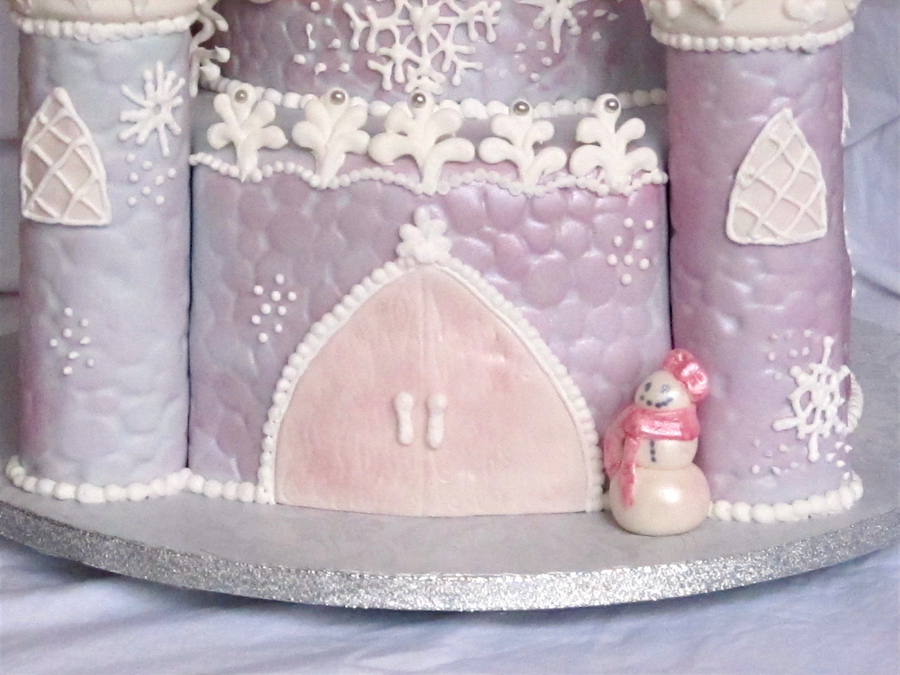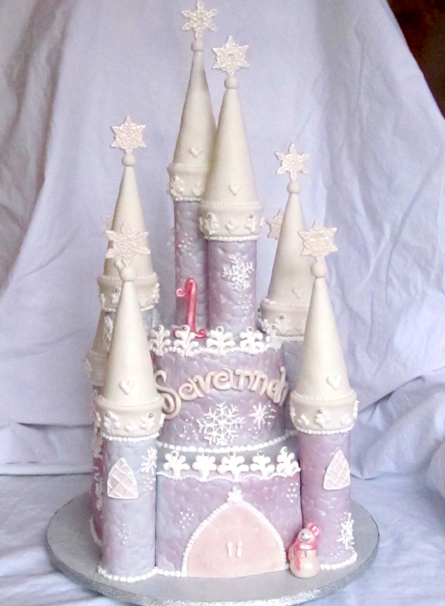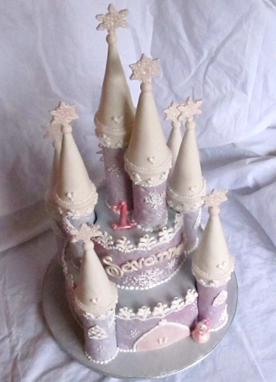 I made this cake fore my niece's 1st Birthday. Her mommy wanted her to have a Snowflake Castle! I looked at pictures of castle cakes for hours to help figure out how I was going to construct it, but this is the design I came up with. The cake is chocolate fudge w/ caramel cream filling and caramel buttercream. Covered in fondant with fondant and royal icing decorations. I used paper towel rolls for the turrets and ice cream cones for the tops of the turrets. Almost everything is dusted with pink and/or white pearl dust, so it looks very frosty and iridescent, the pics don't do it justice! This is my first attempt at a castle cake, but it was a lot of fun to make! Not perfect, but I think she will be very happy with it :)