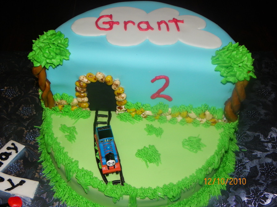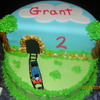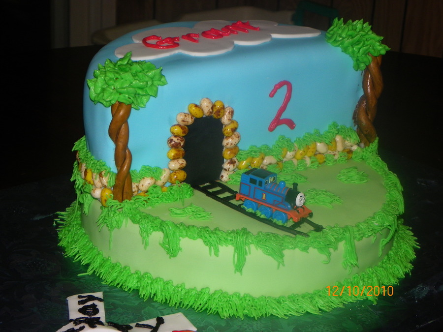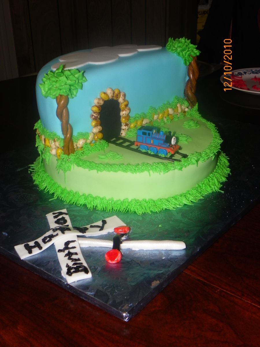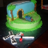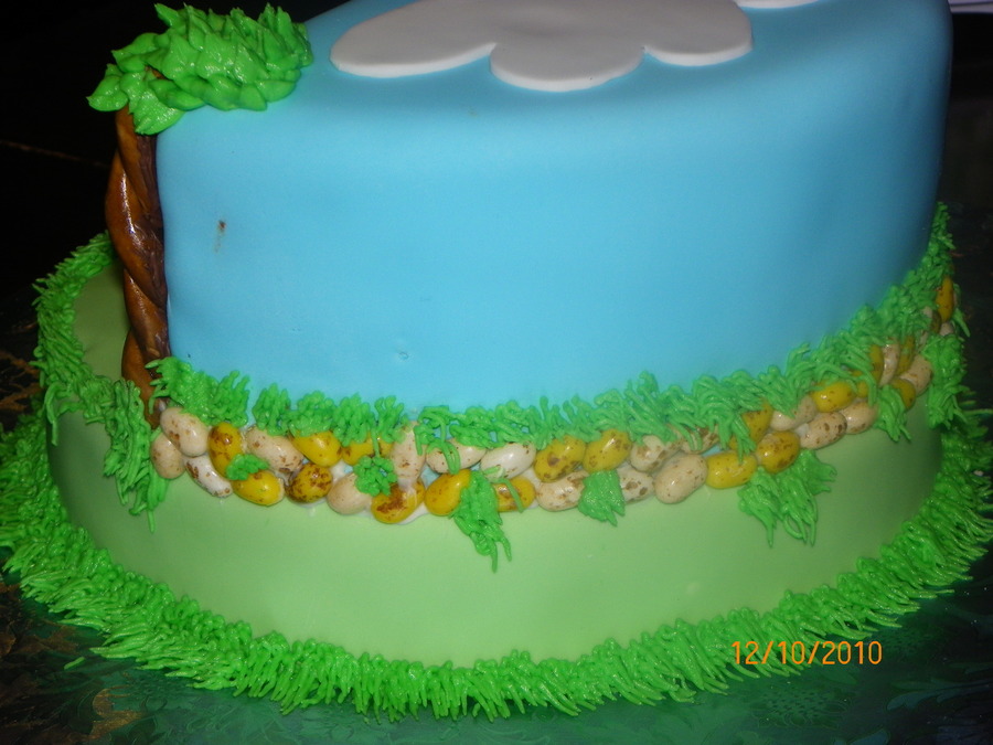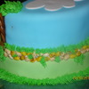 Vanilla cake with fondant figures. "Rocks" are Jelly Beans, attached with chocolate.