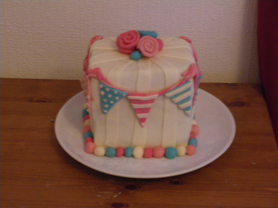 I made this cake while staying with friends in France - the oven was broken so had to buy cake from the supermarket but the only cakes I could find were long, narrow bar cakes! I cut them up and stuck them together with BC - hence the wonkiness! Sadly the picture is a bit grainy but I was pleased with the way the cake turned out.