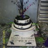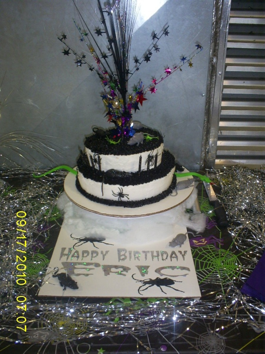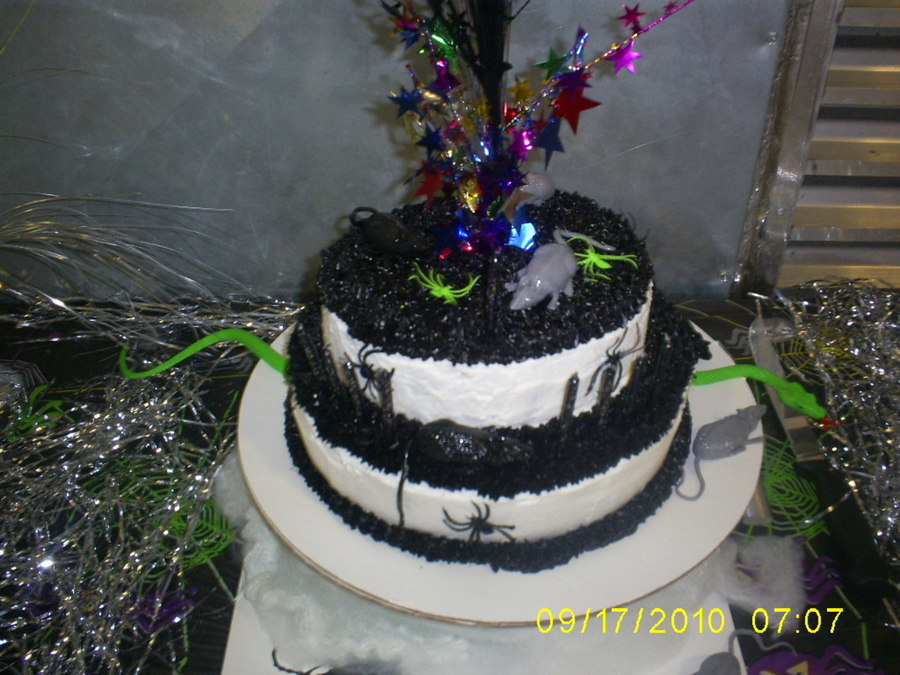 This cake was made for my son's birthday. He loves Billy the Exterminator and wanted a cake incorporated with that theme. I did a two tier chocolate cake with buttercream icing. I trimed the cake in black icing. I used spiders, rats and had a snake going through the cake. He loved the cake. I also made spider cupcakes for the party.