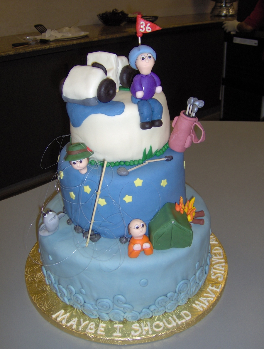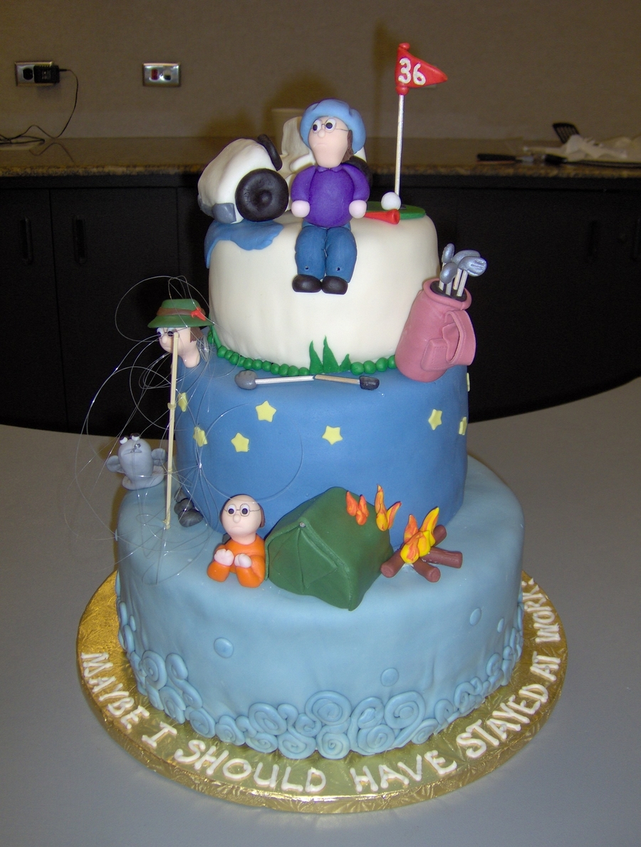 Client wanted all the retirees hobbies looking like they had gone haywire..and maybe he should have stayed at work. Golf cart in a water hazard, tent on fire, fish that got away and Joe tangled up in fishing line