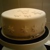 lavenderbiscuit,filled with purechocolateganache, topped with naturel buttercream. covered with basic marzipan and superwhite fondant. topped with white glaze sparkles and the finishing touch white fondant snowflakes