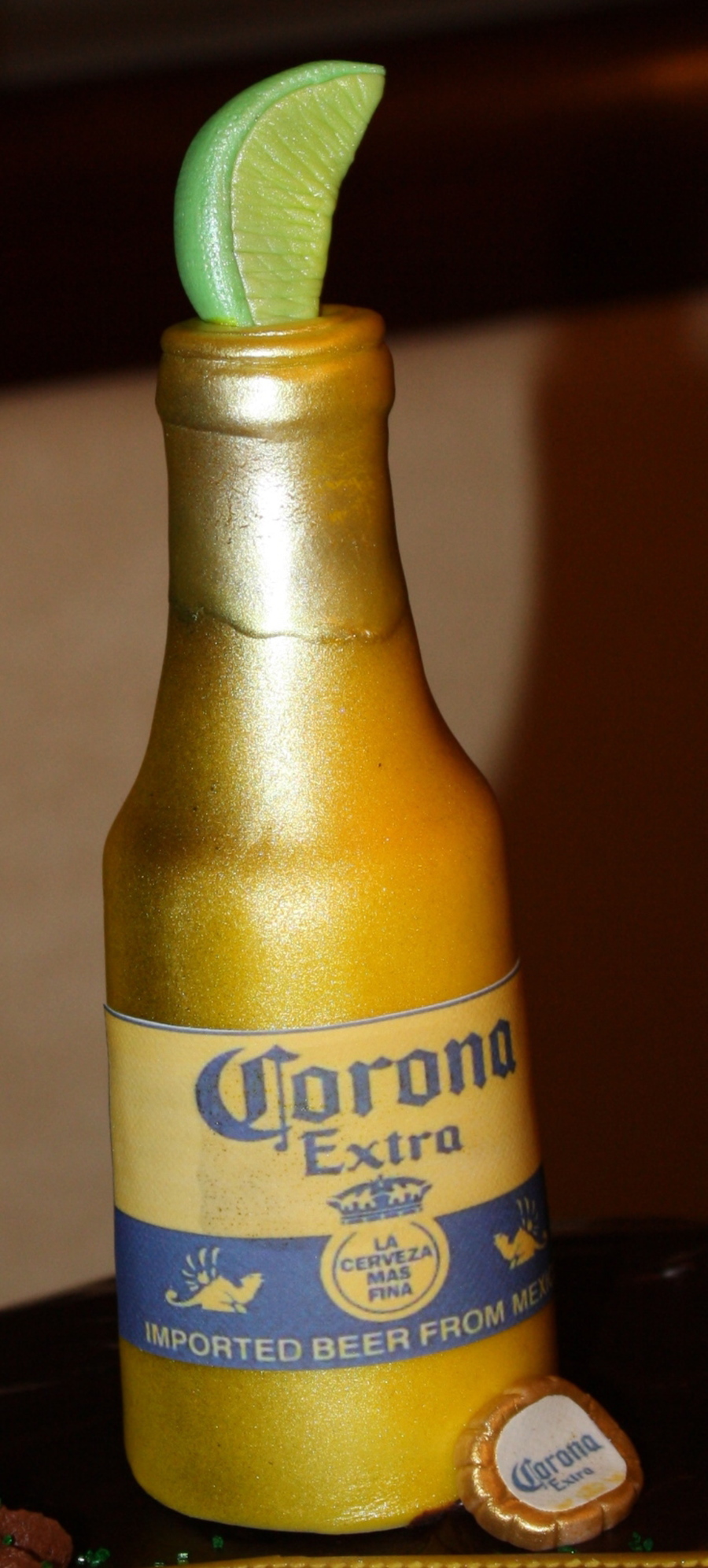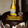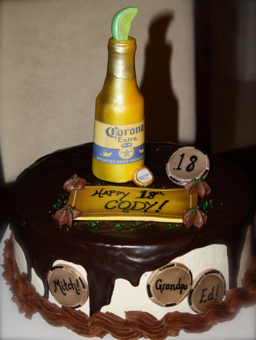 A last minute 18th b - day cake! Chocolate fudge filled with vanilla SMBC and frosted with the same. Covered in chocolate ganache. Modeling chocolate beer bottle covered in fondant, edible image and airbrushed.