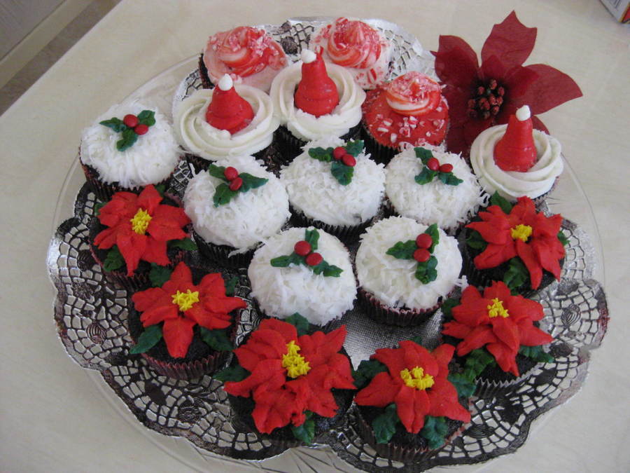 I made these kind of last minute and rushed towards the end. None of which are an original idea of mine I searched tons of photos on CC and took a little from each so I appologize for not giving credit to those who came up with the designs but thanks to all the Super Creative people on here. The last ones I made was the pointsettias and they are kind of sloppy. Chocolate Kalua cupcakes with buttercream frosting Gold Luster dust on the Pointsettia and silver glitter on the santa hats. TFL