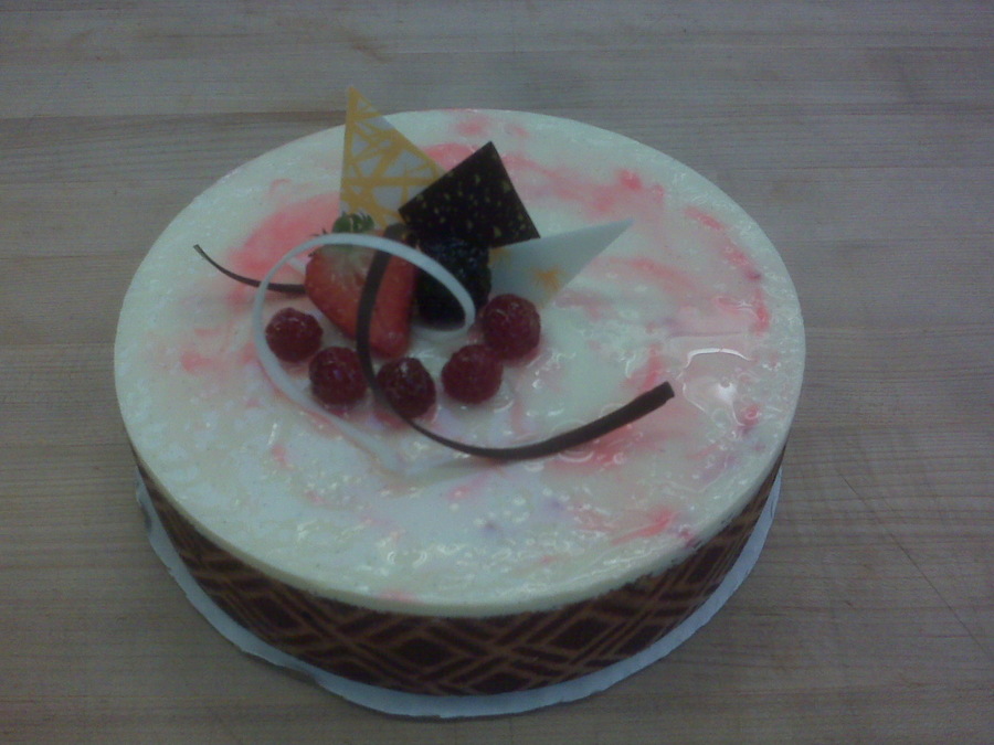 The outer ring is a joconde sponge. Inside there are 2 more layers of an almond -pistachio sponge cake, a layer of raspberry jelly and layers of barvarian cream. The top layer of cream has a light raspberry swirl, topped with chocolate pieces and fresh fruit.