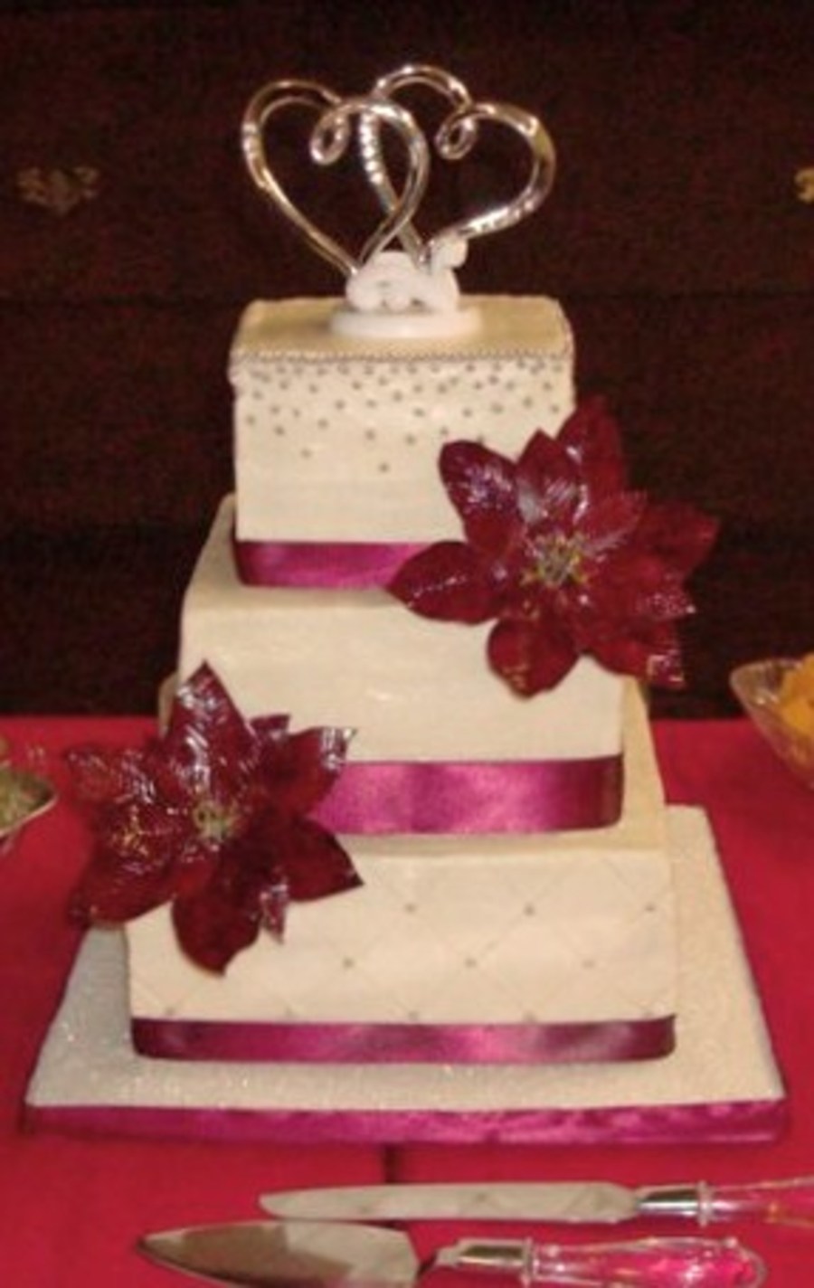 Buttercream cake with gumpaste poinsettias, satin ribbon, and silver dragees.