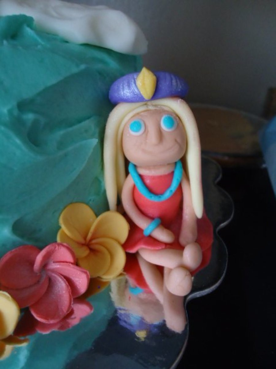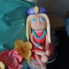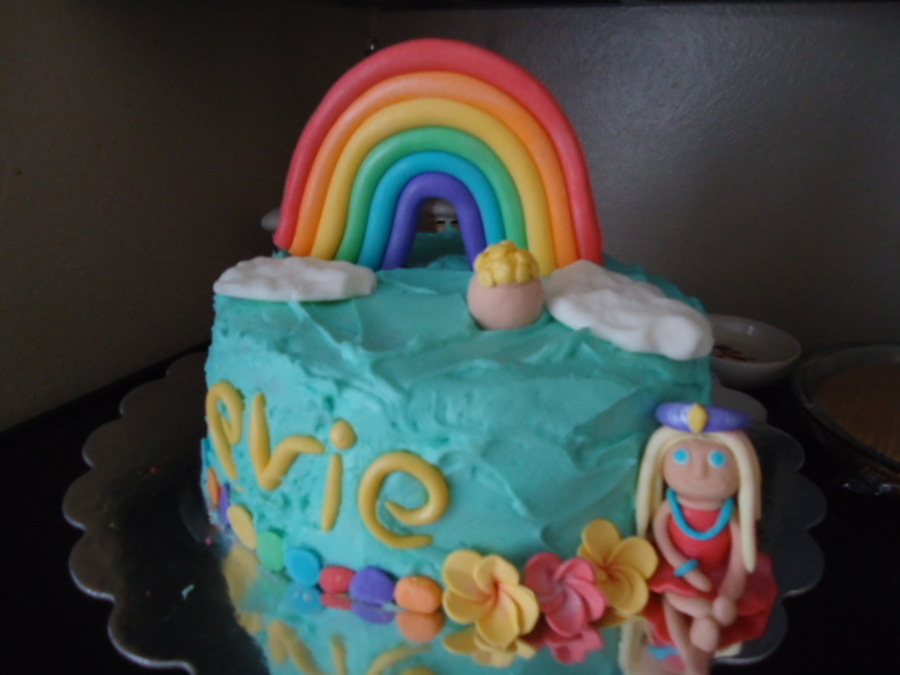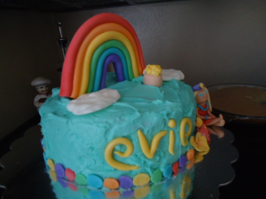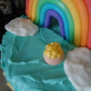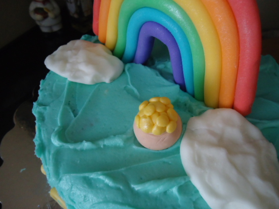 This cake was my favorite and best so far I think!!!! The rainbow and figure are fondant including the border, the gold pot is gum paste, the gold fondant, the flowers are gum paste and the figure and her grown are fondant, the clouds are royal icing!