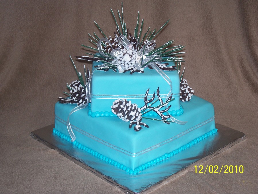 Fondant covered cakes (12" and 8") Choc. pinecones, choc. branches, spaghetti dipped in choc. pine needles.