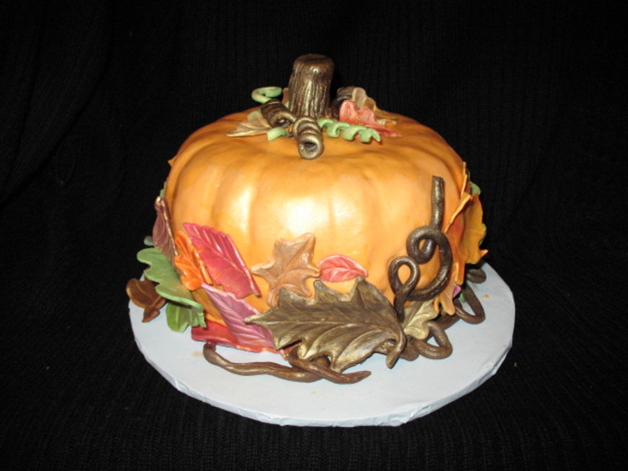 Pumpkin spice cake with cinnamon cream cheese filling. Gumpaste leaves and twigs. Edible gold spray since I don't have an airbrush system yet.
