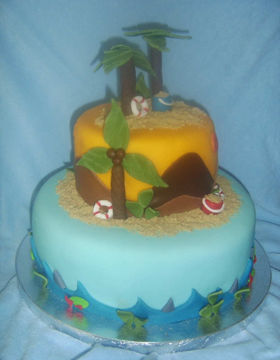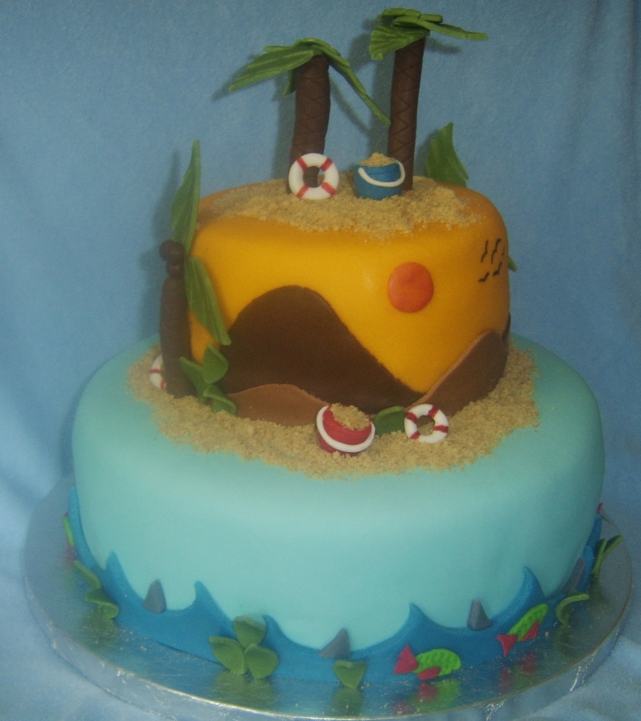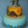 Beach themed cake I made. Bottom tier is Bailey's Irish Cream Cake with Bailey's BC filling. Top tier is French Vanilla Cake with BC filling. All decorations are handmade from fondant.