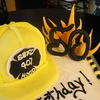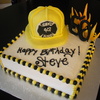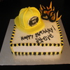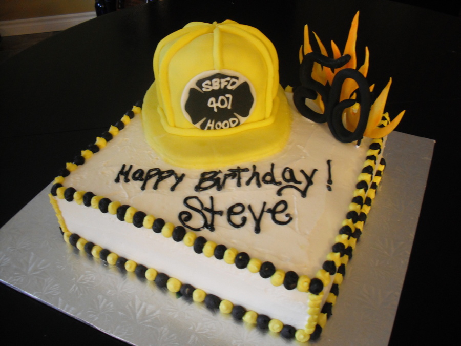 14 inch layered chocolate and vanilla, vanilla buttercream. Sculpted fireman hat out of 8 inch layers then covered in fondant.